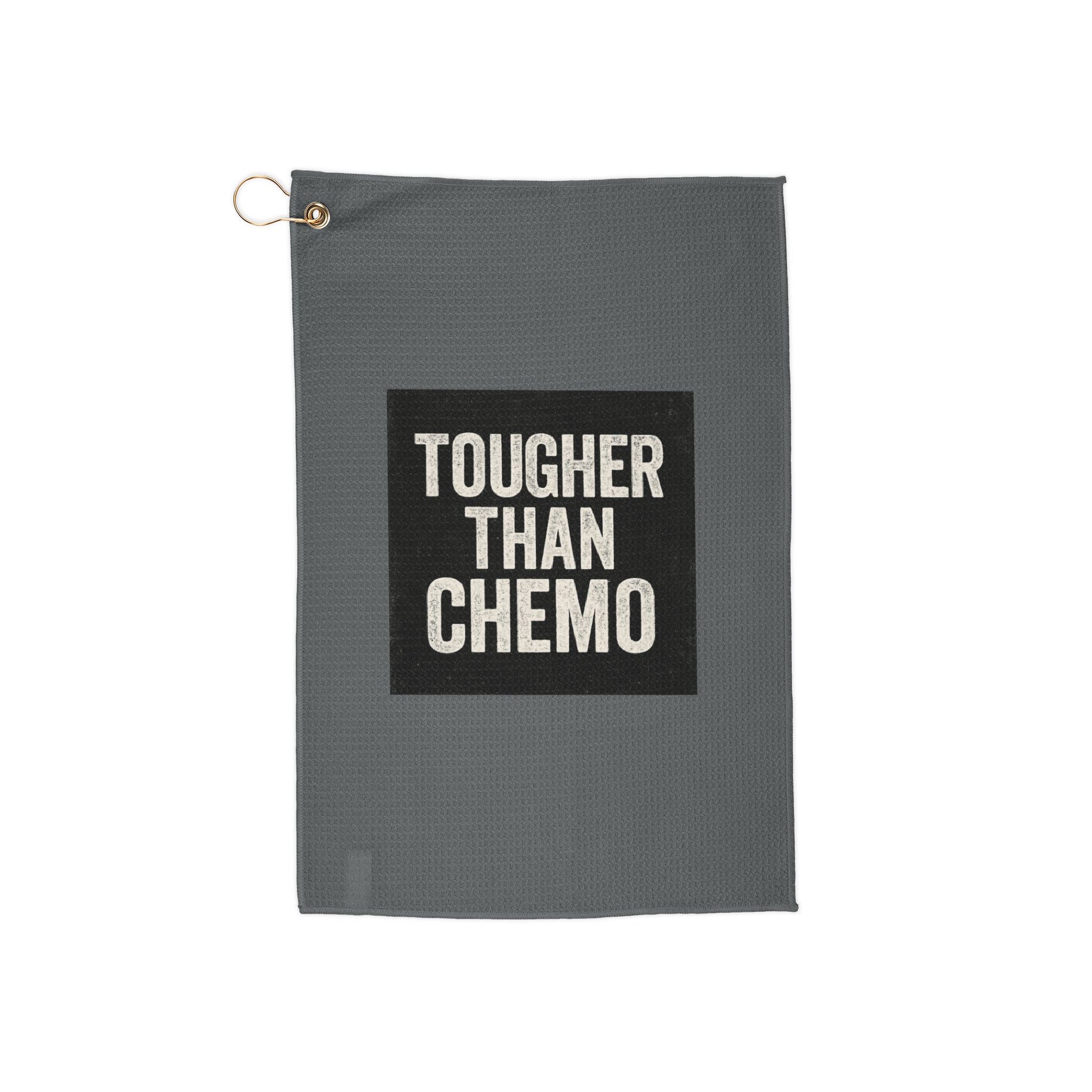 Show your strength on and off the course with this “Tougher Than Chemo” small towel. Designed for resilience and style, it’s the perfect mix of practicality and inspiration.  Made from a durable microfiber blend, this towel keeps your gear clean and dry while making a bold statement of courage. Whether you’re playing in a tournament, practicing at the range, or gifting to a fighter who loves golf, this towel is more than an accessory — it’s a reminder of strength.  Features:  Material: 80% polyester, 20% polyamide blend microfiber  Size: 16″ × 24″ (40.64cm × 60.96cm)  Includes gold grommet and ring for easy attachment  One-sided print with bold “Tougher Than Chemo” design  Lightweight, durable, and highly absorbent  A thoughtful gift for golfers, cancer warriors, survivors, athletes, or anyone who plays tough.